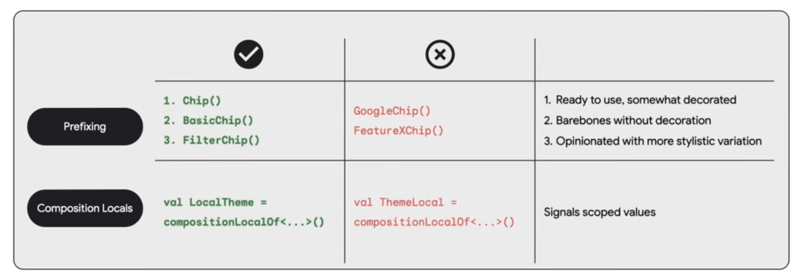 이렇게 하면 최소한의 수정으로 발전하기 쉽게 하고, Compose 생태계 전반에서 일관성을 유지하며, 직관적이고 알려진 패턴을 따르며, 다른 사람들을 올바른 설계 방향으로 안내함으로써 더 좋은 설계를 장려할 수 있습니다.
